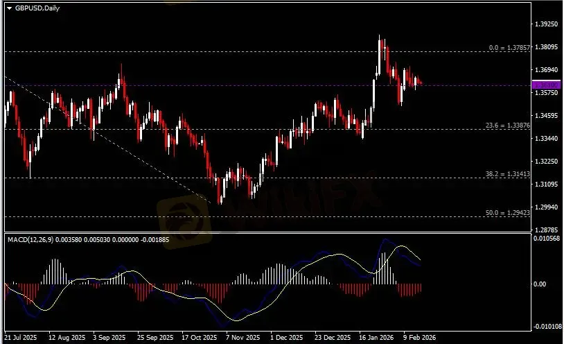 日线图显示英镑兑美元震荡回落,当前逼近1.3610支撑。从MACD来看,快慢线向下运行,红色动能柱则温和收缩。汇价走势和动能柱的变化呈分歧。