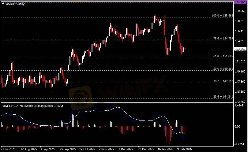 日线图显示美元兑日元低位反弹,当前仍承压于154.80阻力。从MACD来看,快慢线向下扩张,红色动能柱则温和收缩。汇价走势基本和动能柱的变化一致。