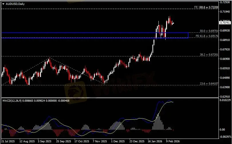 日线图显示澳元兑美元回调暂缓,当前仍企稳于0.6920-0.6970支撑区域。从MACD来看,快慢线形成死叉,红色动能柱温和增量。汇价走势和动能柱的变化呈分歧。