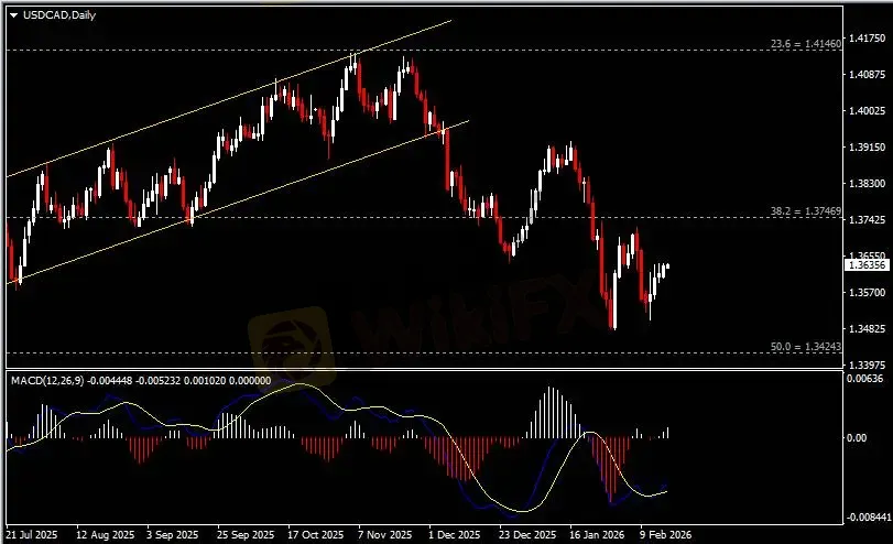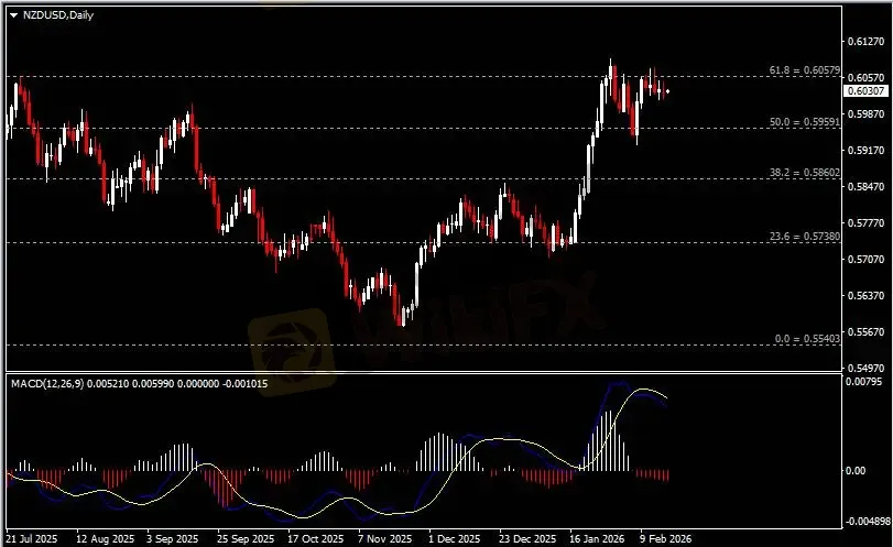 日线图显示纽元兑美元高位回调,当前承压于0.6060阻力。从MACD来看,快慢线向下运行,红色动能柱温和增量。汇价走势基本和动能柱的变化一致。