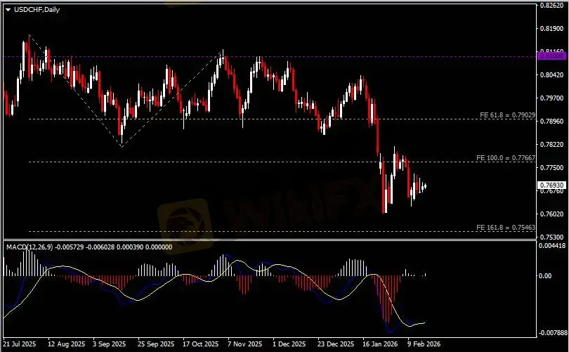 日线图显示美元兑瑞郎于区间震荡,当前承压于0.7770阻力。从MACD来看,快慢线向上运行,白色动能柱恢复增量。汇价走势基本和动能柱的变化一致。