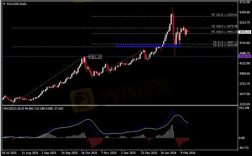 日线图显示金价震荡下挫,当前仍收于4940支撑。从MACD来看,快慢线向下运行,红色动能柱恢复增量。金价走势基本和动能柱的变化一致。