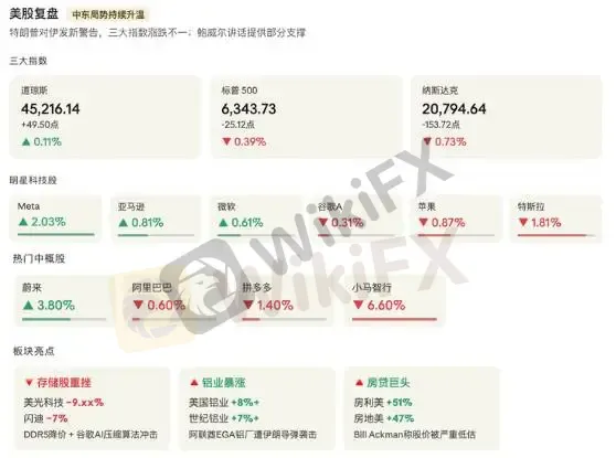 市场在特朗普"4月6日谈判期限"的乐观预期与持续升级的中东军事局势之间反复拉锯,鲍威尔偏鸽表态提供部分支撑;板块层面高度分化,铝业(美国铝业+8%)因伊朗袭击阿联酋铝厂暴涨,房利美、房地美受Ackman喊多分别飙升51%和47%,存储股则在DDR5降价叠加谷歌AI压缩算法冲击下持续重挫,美光单日再跌近10%。