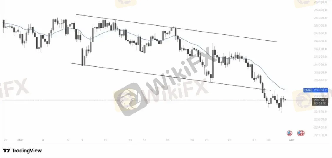 4小时图显示,价格从25,200高点持续震荡下行,通道结构清晰完整,空头节奏稳定。EMA20全程压制价格运行,当前报23,350,与价格之间的背离收窄,显示短线抛压有所减缓,但均线方向依然朝下,趋势性做多条件尚未成立。