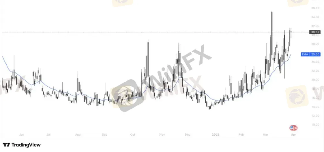目前 VIX 日线图呈现出极为强劲的上升通道,价格已成功突破 30.62 的关键心理位。值得注意的是,EMA 20 (25.66) 已由前期的阻力完全转化为本轮拉升的“生命线”,每当指数回踩该均线均获得强力支撑反弹。3 月中旬虽曾出现冲高回落的长上影线,但近期价格重心持续抬高,显示空头回补波动率的压力巨大。在 VIX 未能有效跌破 28.00 支撑区间前,美股大盘恐将持续承压,投资者需警惕市场波动率进一步向 35.00 历史高位冲击带来的系统性风险。