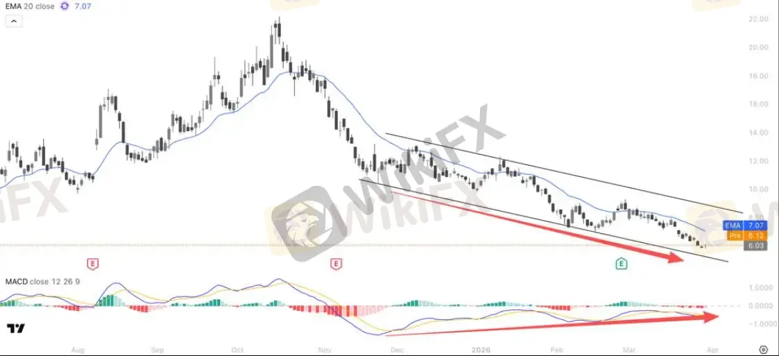 SOUN 自 2025 年 10 月阶段高点开启持续下行趋势,股价始终运行在标准的下降通道内不断刷新阶段低点,当前价格已下探至 6.03 关键支撑位,始终承压于数值 7.07 的 20 周期 EMA 均线之下,短期趋势偏弱;但技术层面出现明确的反转信号,在股价持续创出新低的同时,下方 MACD 指标并未同步跟随创出新低,反而走出持续抬升的上行走势,与价格形成了经典的看涨底背离结构,这一信号意味着本轮下跌的空头动能已显著衰竭,下跌趋势的延续性大幅减弱,若后续股价能突破下降通道上沿压力并站稳 20 周期 EMA 均线,有望正式开启反弹修复行情。