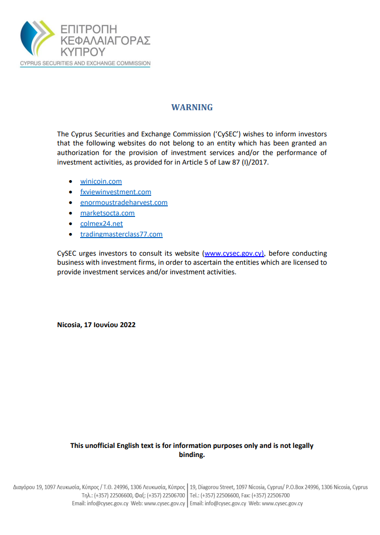 警告 塞浦路斯证券交易委员会 ('cysec') 希望通知投资者,以下网站不属于已获得授权提供投资服务和/或执行投资活动的实体,如规定第 87 (i)/2017 号法律第 5 条。  winicoin.com  fxviewinvestment.com  hugetradeharvest.com  marketocta.com  Colmex 24.net  Tradingmasterclass77 .com cysec 敦促投资者在与投资公司开展业务之前查阅其网站 (www.cysec.gov.cy),以确定获得许可提供投资服务和/或投资活动的实体。