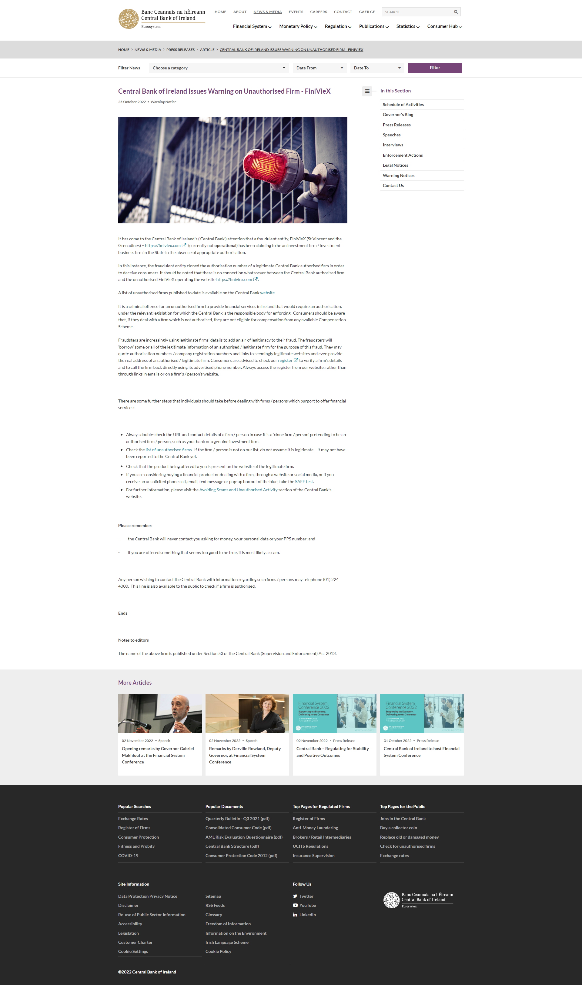 2022 年 10 月 25 日警告通知警告爱尔兰中央银行(“中央银行”)注意欺诈实体, FiniVieX (圣文森特和格林纳丁斯)- https:// FiniVieX .com(目前未运营)在没有适当授权的情况下一直声称自己是该州的一家投资公司/投资业务公司。在这种情况下,欺诈实体克隆了一家合法的中央银行授权公司的授权号码,以欺骗消费者。应该指出的是,中央银行授权的公司与未经授权的公司之间没有任何联系 FiniVieX运营网站 https:// FiniVieX .com。迄今为止公布的未经授权公司名单可在中央银行网站上查阅。根据中央银行负责执行的相关立法,未经授权的公司在爱尔兰提供需要授权的金融服务属于刑事犯罪。消费者应该意识到,如果他们与未经授权的公司打交道,他们就没有资格从任何可用的补偿计划中获得补偿。欺诈者越来越多地使用合法公司的详细信息来为他们的欺诈行为增添合法性。欺诈者将出于此欺诈目的“借用”授权/合法公司的部分或全部合法信息。他们可能会引用授权号/公司注册号和看似合法网站的链接,甚至提供授权/合法公司的真实地址。建议消费者检查我们的登记册以验证公司的详细信息,并使用其广告电话号码直接给公司回电。始终从我们的网站访问注册表,而不是通过电子邮件或公司/个人网站上的链接。在与声称提供金融服务的公司/个人打交道之前,个人应该采取一些进一步的步骤:始终仔细检查公司/个人的 URL 和联系方式,以防它是假装的“克隆公司/个人”授权公司/个人,例如您的银行或真正的投资公司。检查未经授权的公司名单。如果公司/个人不在我们的名单上,请不要认为它是合法的——它可能还没有报告给中央银行。检查提供给您的产品是否出现在合法公司的网站上。如果您正在考虑通过网站或社交媒体购买金融产品或与公司打交道,或者如果您突然收到未经请求的电话、电子邮件、短信或弹出框,请参加安全测试。如需更多信息,请访问中央银行网站的避免诈骗和未经授权的活动部分。请记住:- 中央银行绝不会联系您索取金钱、您的个人数据或您的 PPS 号码;并且 - 如果向您提供的东西好得令人难以置信,那很可能是骗局。任何希望就此类公司/个人的信息联系中央银行的人都可以致电 (01) 224 4000。公众也可以使用此热线查询公司是否获得授权。