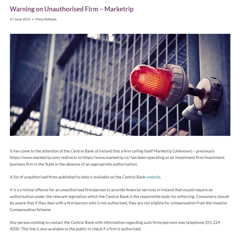 2021 年 6 月 17 日新闻稿警告称,爱尔兰中央银行注意到一家自称是 Marketrip(未知)——之前是 https://www. Marketrip .com;重定向到 https://www. Marketrip .co/ 在没有适当授权的情况下一直在该州作为投资公司/投资商业公司运营。迄今为止公布的未经授权公司名单可在中央银行网站上查阅。根据中央银行负责执行的相关立法,未经授权的公司/个人在爱尔兰提供需要获得授权的金融服务属于刑事犯罪。消费者应该意识到,如果他们与未经授权的公司/个人打交道,他们将没有资格从投资者补偿计划中获得补偿。任何希望就此类公司/个人的信息联系中央银行的人都可以拨打电话 (01) 224 4000。公众也可以拨打此热线查询一家公司是否获得授权。