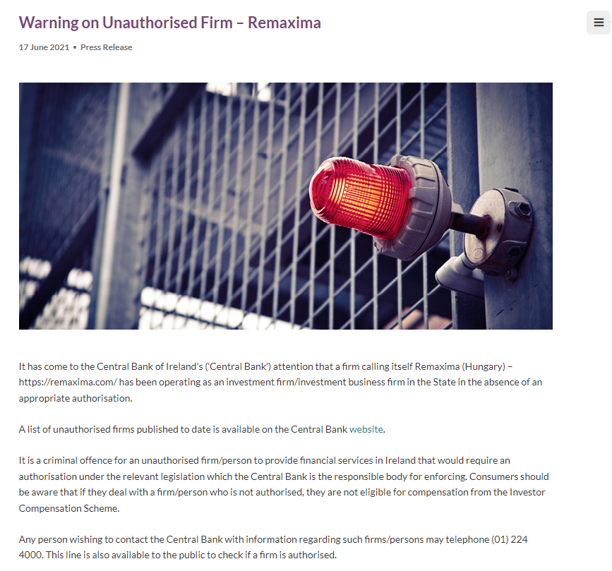 2021 年 6 月 17 日新闻稿警告称,一家自称的公司已引起爱尔兰中央银行(“中央银行”)的注意 REMAXIMA(匈牙利)- https:// REMAXIMA .com/ 在没有适当授权的情况下一直在该州作为投资公司/投资商业公司运营。迄今为止公布的未经授权公司名单可在中央银行网站上查阅。根据中央银行负责执行的相关立法,未经授权的公司/个人在爱尔兰提供需要获得授权的金融服务属于刑事犯罪。消费者应该意识到,如果他们与未经授权的公司/个人打交道,他们将没有资格从投资者补偿计划中获得补偿。任何希望就此类公司/个人的信息联系中央银行的人都可以拨打电话 (01) 224 4000。公众也可以拨打此热线查询一家公司是否获得授权。