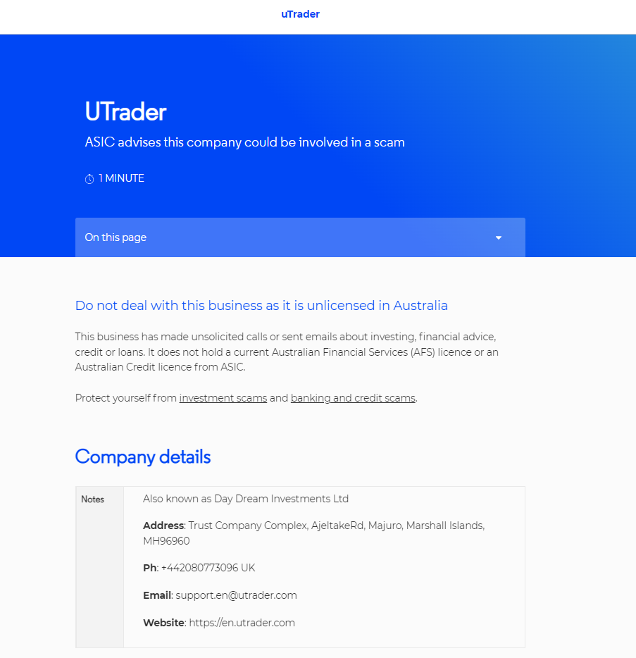 投资者警示名单 UTrader 澳大利亚证券投资委员会提醒该公司可能涉及诈骗.