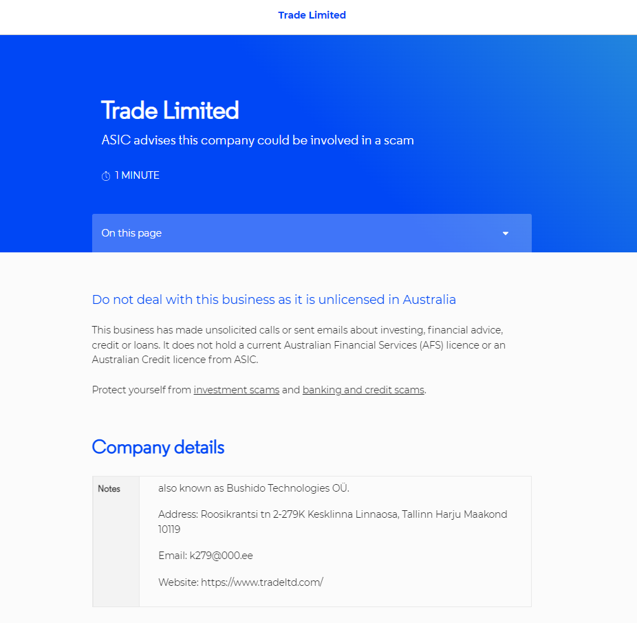 trade limited asic advises this company could be involved in a scam page reading time:1 minute on this page do not deal with this business as it is unlicensed in Australia 这家公司主动打电话或发送有关投资、财务建议、信贷或贷款。它不持有当前的澳大利亚金融服务 (afs) 许可证或 asic 的澳大利亚信贷许可证。保护自己免受投资诈骗以及银行和信贷诈骗。公司详细信息注释也称为 bushido technologies ou。地址:roosikrantsi tn 2-279k kesklinna linnaosa, tallinn harju maakond 10119 电子邮件:k279@000.ee 网站:https://www. TradeLTD .com/