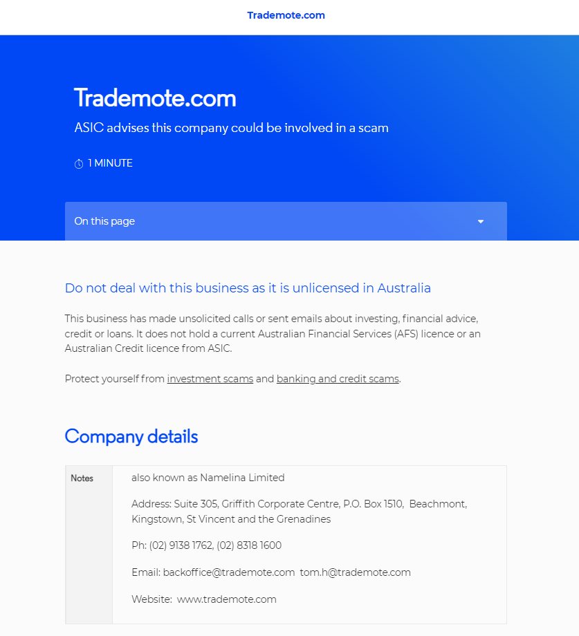Trademote.com asic advises this company could be involved in a scam page reading time:1 minute on this page do not deal with this business as it is unlicensed in australia 这家公司主动打电话或发送有关投资、财务建议、信贷或贷款。它不持有当前的澳大利亚金融服务 (afs) 许可证或 asic 的澳大利亚信贷许可证。保护自己免受投资诈骗以及银行和信贷诈骗。公司详细信息备注也称为 namelina 有限地址:suite 305, griffith corporate centre, po box 1510, beachmont, kingstown, st vincent and the grenadines 电话:(02) 9138 1762,(02) 8318 1600 电子邮件:backoffice@ Trademote .com 汤姆.h@ Trademote .com 网站:www. Trademote .com