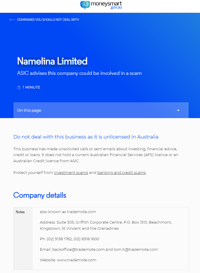 namelina Limited asic 建议该公司可能涉及诈骗 页面阅读时间:此页面 1 分钟 不要与该企业打交道,因为该企业在澳大利亚未经许可 该企业已主动拨打电话或发送有关投资、财务建议、信贷或贷款。它不持有当前的澳大利亚金融服务(AFS)许可证或澳大利亚证券投资委员会(ASIC)颁发的澳大利亚信贷许可证。保护自己免受投资诈骗以及银行和信贷诈骗。公司详细信息注释也称为 Trademote.com 地址:suite 305, griffith Corporate center, po box 1510, beachmont, kingstown, st Vincent and the Grenadines 电话:(02) 9138 1762、(02) 8318 1600 电子邮件:backoffice@ Trademote .com 和 tom.h@ Trademote .com 网站:www. Trademote .com
