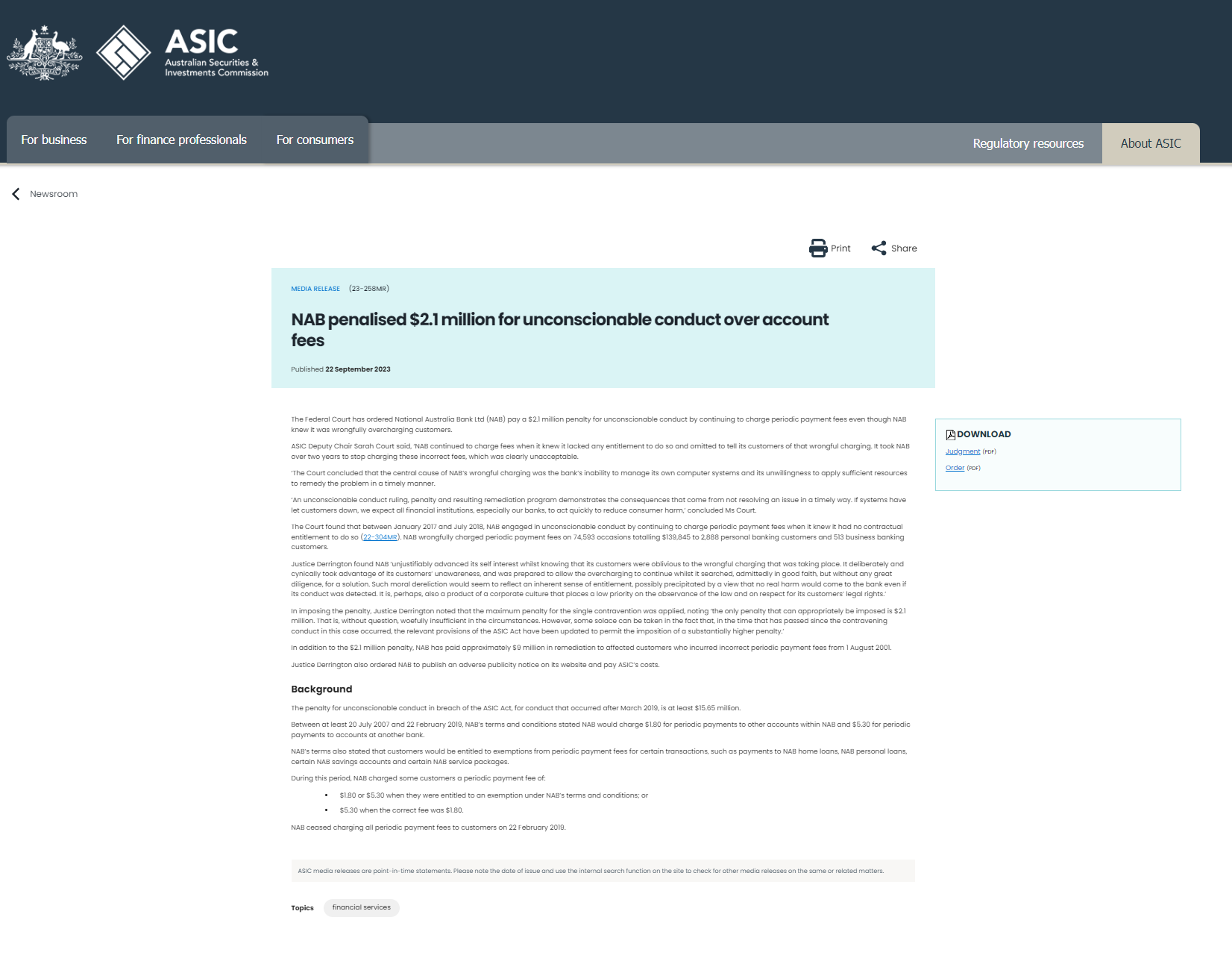 媒体发布 (23-258MR) NAB 因账户费用不合理行为而被处以 210 万美元罚款 发布于 2023 年 9 月 22 日 联邦法院已命令澳大利亚国民银行有限公司 (NAB) 因继续收取定期付款费用而支付 210 万美元的不合理行为罚款国民银行知道它错误地向客户收取过高费用。 ASIC 副主席莎拉·考特 (Sarah Court) 表示:“NAB 在明知自己没有权利这样做的情况下仍继续收取费用,并且没有告知客户这一错误收费。 NAB花了两年多的时间才停止收取这些不正确的费用,这显然是不可接受的。法院的结论是,国民银行错误收费的主要原因是该银行无法管理自己的计算机系统,并且不愿动用足够的资源及时纠正问题。 “不合情理的行为裁决、处罚以及由此产生的补救计划表明了不及时解决问题所带来的后果。如果系统让客户失望,我们希望所有金融机构,特别是我们的银行,迅速采取行动,减少消费者的伤害,”考特女士总结道。法院认定,2017 年 1 月至 2018 年 7 月期间,NAB 在明知自己没有合同权利的情况下继续收取定期付款费用,这是不合理的行为 (22-304MR)。 NAB 向 2,888 名个人银行客户和 513 名商业银行客户错误地收取了 74,593 次定期付款费用,总计 139,845 美元。德林顿法官认为,国民银行“在明知其客户对正在发生的错误收费毫不知情的情况下,无理地推进其自身利益”。它故意而愤世嫉俗地利用了客户的不知情,并准备允许过度收费继续下去,同时它诚然地真诚地但没有任何努力地寻找解决方案。这种道德失范似乎反映了一种固有的权利意识,可能是由于这样一种观点所促成的,即即使银行的行为被发现,也不会对银行造成真正的伤害。也许,这也是一种不重视遵守法律和尊重客户合法权利的企业文化的产物。在判处处罚时,德林顿法官指出,对单一违规行为适用了最高处罚,并指出“唯一可以适当判处的处罚是 210 万美元”。毫无疑问,在这种情况下,这是远远不够的。然而,令人欣慰的是,自本案发生违规行为以来,ASIC 法案的相关条款已经更新,允许处以更高的处罚。除了 210 万美元的罚款外,NAB 还向自 2001 年 8 月 1 日起产生不正确定期付款费用的受影响客户支付了约 900 万美元的补救费用。德林顿法官还命令 NAB 在其网站上发布不利的宣传通知,并支付 ASIC 的费用。下载判决书(PDF) 命令(PDF) 背景 对于 2019 年 3 月之后发生的违反 ASIC 法案的不合理行为,罚款至少为 1,565 万美元。至少在2007年7月20日至2019年2月22日期间,NAB的条款和条件规定,NAB将对NAB内其他账户的定期付款收取1.80美元,对另一家银行账户的定期付款收取5.30美元。 NAB 的条款还规定,客户将有权免除某些交易的定期付款费用,例如支付 NAB 住房贷款、NAB 个人贷款、某些 NAB 储蓄账户和某些 NAB 服务套餐。在此期间,NAB 向一些客户收取定期付款费用: 1.80 美元或 5.30 美元(当他们根据 NAB 的条款和条件有权获得豁免时);或当正确费用为 1.80 美元时为 5.30 美元。 NAB 于 2019 年 2 月 22 日停止向客户收取所有定期付款费用。