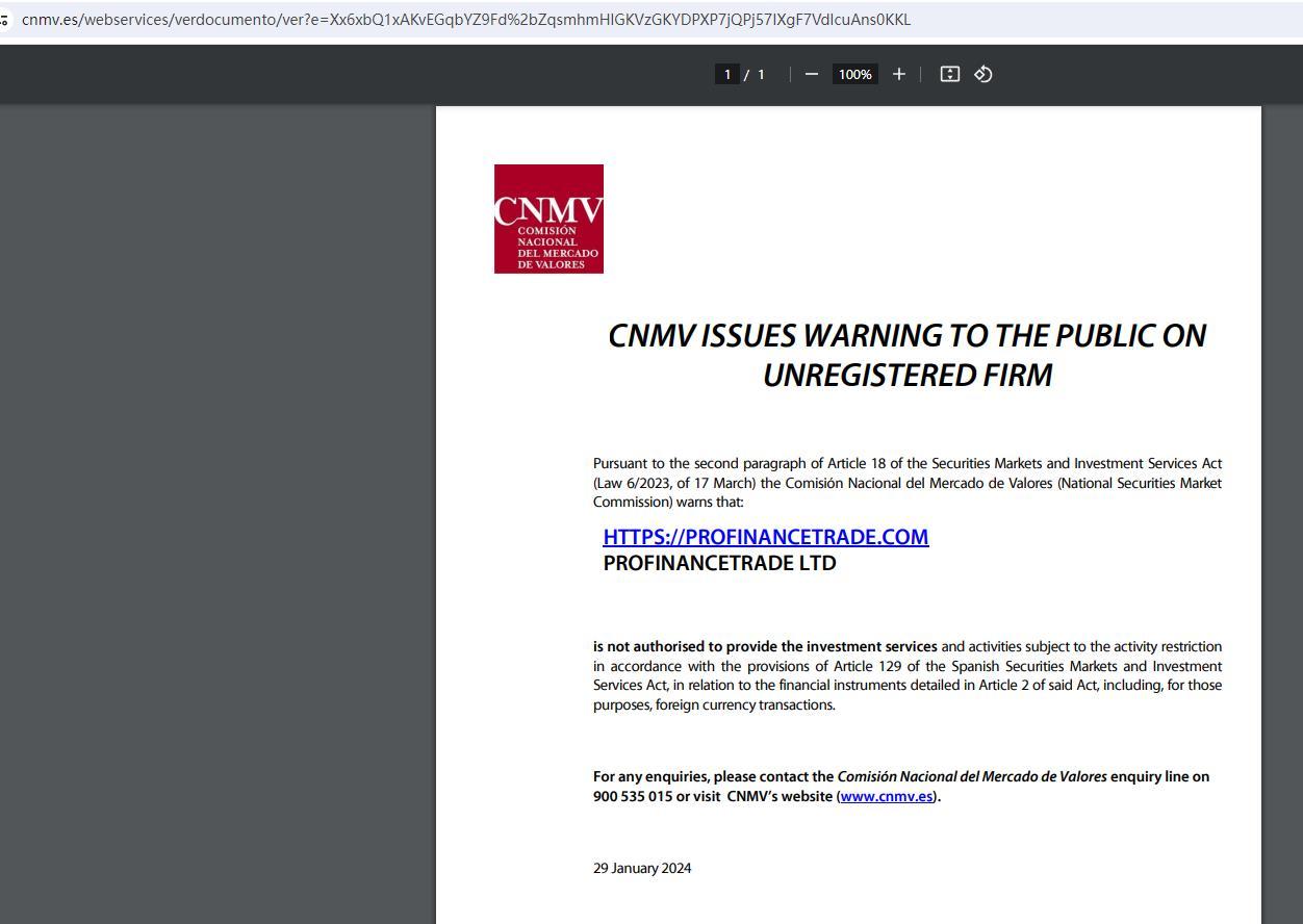 cnmv 根据《证券市场和投资服务法》(3 月 17 日第 6/2023 号法律)第 18 条第 2 款向公众发出关于未注册公司的警告。 : https:// Profinancetrade .com Profinancetrade根据《西班牙证券市场和投资服务法》第 129 条的规定,有限公司无权提供受活动限制的投资服务和活动,涉及该法第 2 条详述的金融工具,包括:为此目的,进行外币交易。如有任何疑问,请拨打国家经济委员会咨询热线 900 535 015 或访问 cnmv 网站 (www.cnmv.es)。 2024 年 1 月 29 日