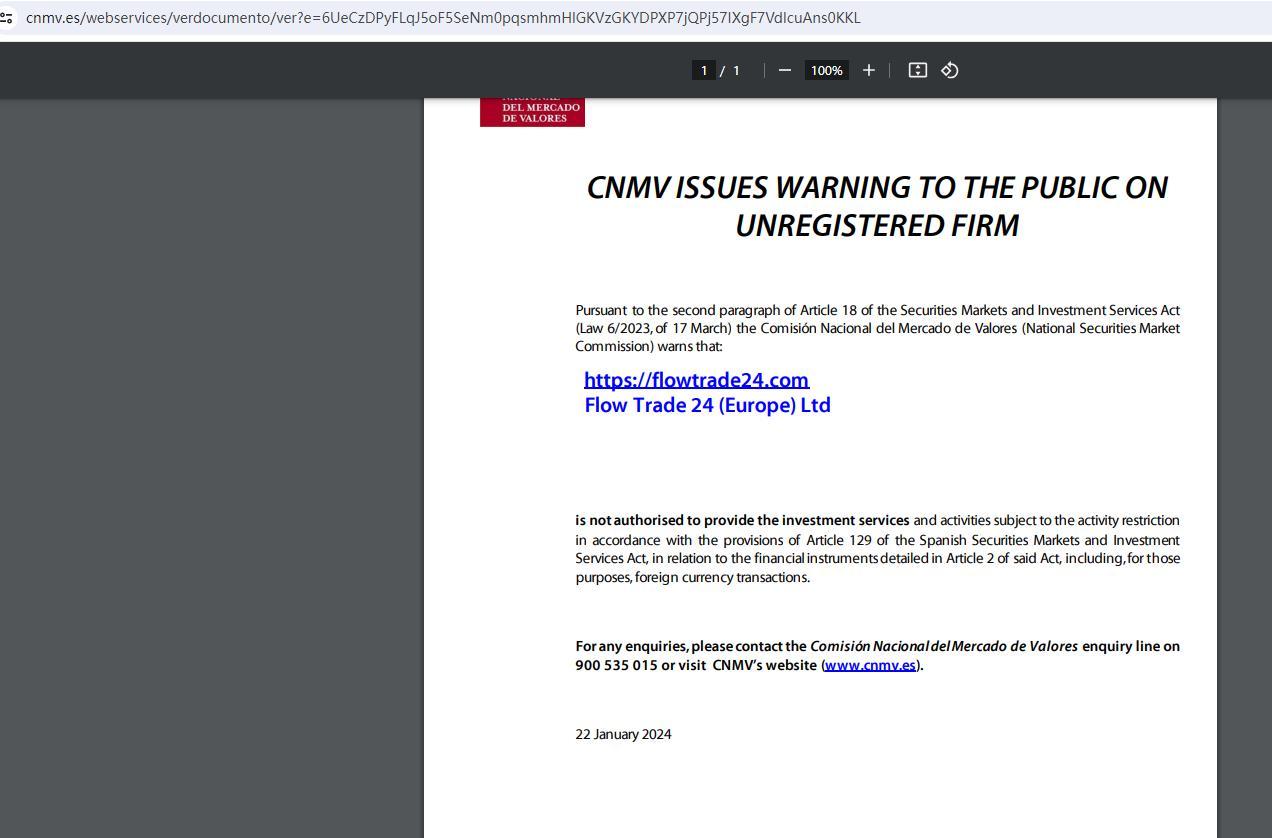 cnmv 根据《证券市场和投资服务法》(3 月 17 日第 6/2023 号法律)第 18 条第 2 款向公众发出关于未注册公司的警告。 :https://flowtrade24.com Flow Trade 24 (Europe) Ltd根据《西班牙证券市场和投资服务法》第 129 条的规定,无权提供受该法第 2 条详述的金融工具限制的投资服务和活动,包括:这些目的,外币交易。如有任何疑问,请拨打国家经济委员会咨询热线 900 535 015 或访问 cnmv 网站 (www.cnmv.es)。 2024 年 1 月 22 日