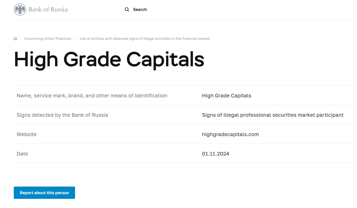 名称、服务标记、品牌和其他识别方式 High Grade Capitals俄罗斯银行发现的迹象 非法专业证券市场参与者的迹象 网站 highgradecapitals.com 日期 2024 年 11 月 1 日