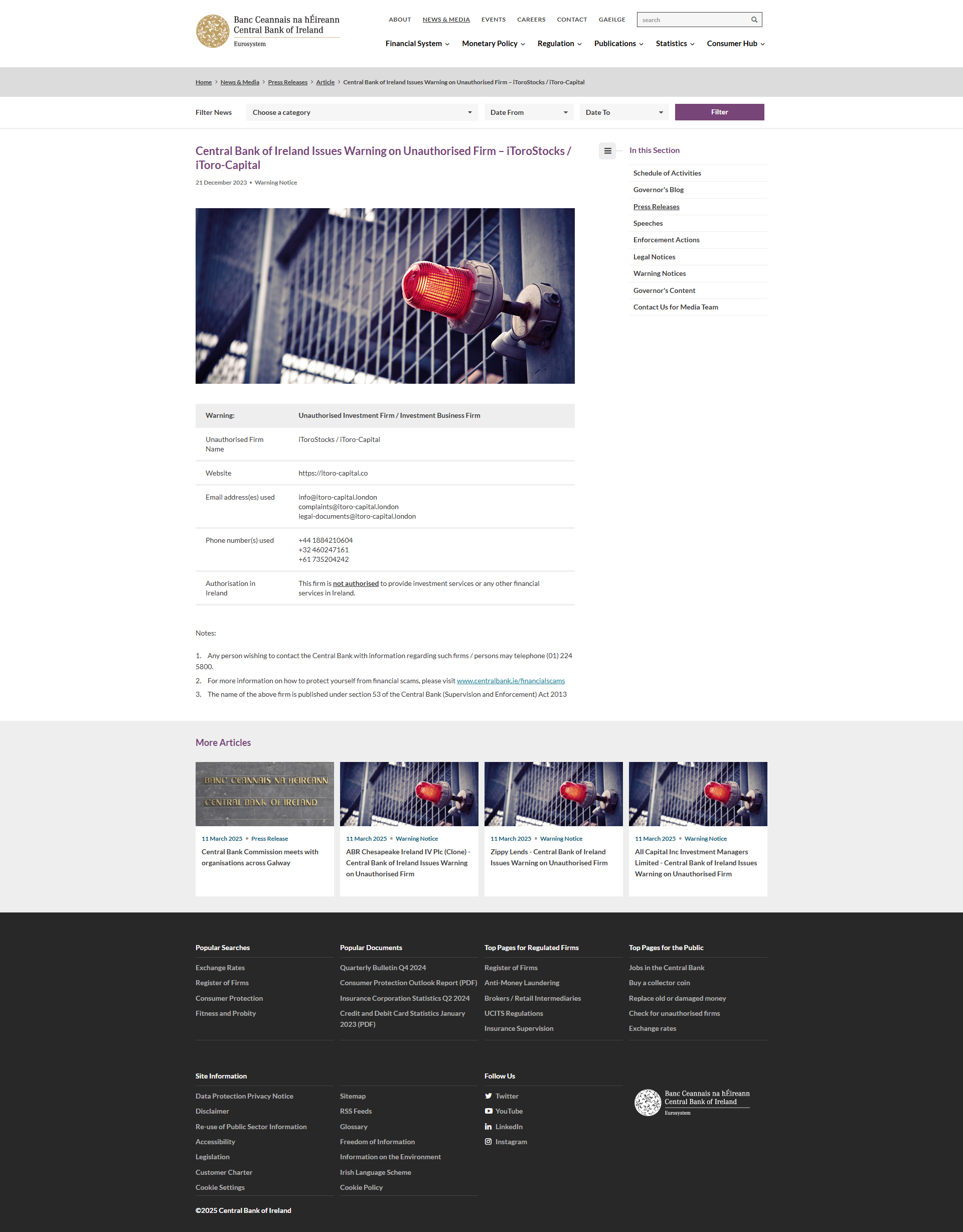 警告:未经授权的投资公司/投资业务公司未经授权的公司名称 iToroStocks/ itoro-capital 网站 https://itoro-capital.co 使用的电子邮件地址 info@itoro-capital.london complaints@itoro-capital.london legal-documents@itoro-capital.london 使用的电话号码 +44 1884210604 +32 460247161 +61 735204242 爱尔兰授权 该公司未获授权在爱尔兰提供投资服务或任何其他金融服务。
