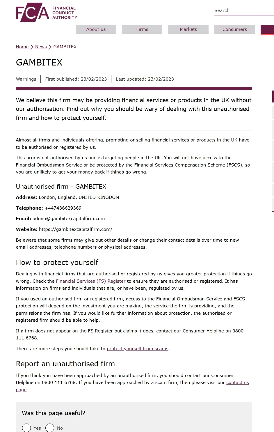 我们认为该公司可能在未经我们授权的情况下在英国提供金融服务或产品。了解为什么您应该警惕与这家未经授权的公司打交道以及如何保护自己。几乎所有在英国提供、推广或销售金融服务或产品的公司和个人都必须获得我们的授权或注册。该公司未获得我们的授权,并且针对英国人。您将无法访问金融申诉服务,也无法受到金融服务补偿计划 (FSCS) 的保护,因此如果出现问题,您不太可能拿回您的钱。未经授权的公司 - GAMBITEX 地址:英国伦敦 电话:+447436629369 电子邮件:admin@gambitexcapitalfirm.com 网站:https://gambitexcapitalfirm.com/ 请注意,一些公司可能会泄露其他详细信息或随着时间的推移将其联系方式更改为新的电子邮件地址、电话号码或实际地址。如何保护自己 与我们授权或注册的金融公司打交道可以在出现问题时为您提供更大的保护。查看金融服务 (FS) 登记册,确保它们已获得授权或注册。它包含受我们监管的公司和个人的信息。如果您使用授权公司或注册公司,则能否获得金融申诉服务和 FSCS 保护将取决于您进行的投资、公司提供的服务以及公司拥有的权限。如果您需要有关保护的更多信息,授权或注册公司应该能够提供帮助。如果某家公司未出现在 FS 登记册上但声称它出现在其中,请致电我们的消费者帮助热线 0800 111 6768。您还应采取更多措施来保护自己免受诈骗。