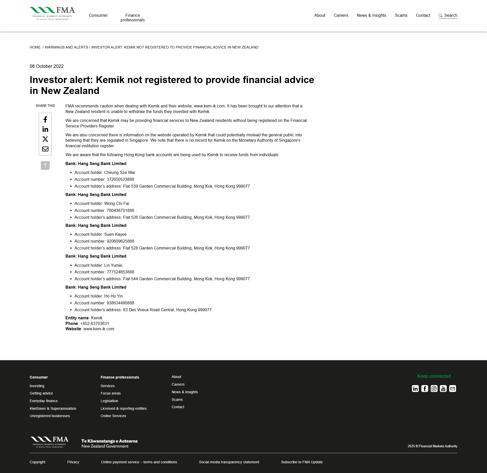 2022 年 10 月 6 日投资者警报: Kemik未在新西兰注册提供财务建议 分享此 fma 建议在处理时谨慎 Kemik以及他们的网站 www.kem-ik.com。我们注意到,新西兰居民无法提取他们投资的资金 Kemik.我们担心 Kemik可能在未在金融服务提供商登记册上注册的情况下向新西兰居民提供金融服务。我们还担心,由 Kemik这可能会误导公众相信它们受到新加坡的监管。我们注意到,没有记录 Kemik在新加坡金融管理局的金融机构登记册上。我们获悉,下列香港银行账户正被 Kemik接收个人款项:银行:恒生银行有限公司帐户持有人:张诗慧帐户号码:372650523888帐户持有人地址:香港旺角花园商业大厦539室999077银行:恒生银行有限公司帐户持有人:黄志辉帐户号码:780438701888帐户持有人地址:香港旺角花园商业大厦526室999077银行:恒生银行有限公司帐户持有人:孙嘉仪帐户号码:920609625888帐户持有人地址:香港旺角花园商业大厦528室999077银行:恒生银行有限公司帐户持有人:林玉梅帐户号码:777524653888帐户持有人地址:花园商业大厦544室香港旺角中环德辅道中 83 号 999077 银行:恒生银行有限公司 账户持有人:何浩贤 账户号码:938634490888 账户持有人地址:香港中环德辅道中 83 号 999077 实体名称: Kemik电话: +852-63703631 网站: www.kem-ik.com