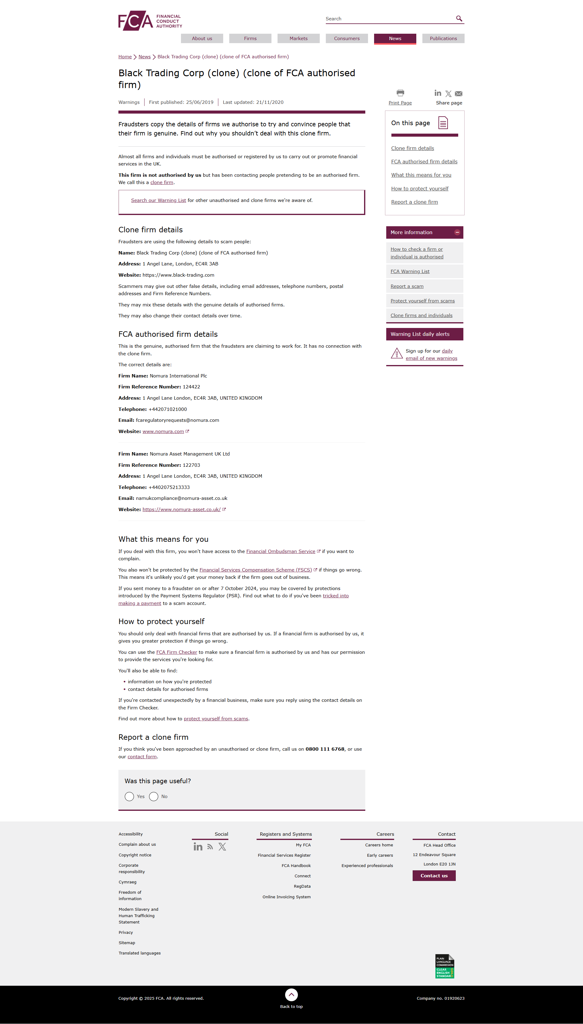 警告 首次发布日期:2019 年 6 月 25 日 最后更新日期:2020 年 11 月 21 日 诈骗分子会复制我们授权公司的详细信息,试图让人们相信他们的公司是真实的。了解为什么不应该与这家克隆公司打交道。几乎所有公司和个人都必须获得我们的授权或注册才能在英国开展或推广金融服务。这家公司未经我们授权,但一直在联系假装是授权公司的人员。我们称之为克隆公司。在我们的警告列表中搜索我们知道的其他未经授权和克隆公司。 克隆公司详细信息 诈骗分子使用以下详细信息来诈骗人们: 名称:black trading corp (clone)(FCA 授权公司的克隆公司) 地址:1 angel lane, london, ec4r 3ab 网站:https://www.black-trading.com 诈骗分子可能会提供其他虚假信息,包括电子邮件地址、电话号码、邮政地址和公司参考编号。他们可能会将这些信息与授权公司的真实信息混淆。他们还可能随着时间的推移更改他们的联系方式。FCA授权公司的详细信息,这是诈骗者声称为其工作的真正的授权公司。它与克隆公司没有任何关系。正确的信息是:公司名称: 野村国际有限公司公司参考编号:124422 地址:1 angel lane london, ec4r 3ab, united kingdom 电话:+442071021000 电子邮件:fcaregulatoryrequests@ 野村 .com 网站:www. 野村 .comlink 是外部公司名称: 野村 Asset Management UK Ltd. 公司编号:122703 地址:1 Angel Lane London, EC4R 3AB, United Kingdom 电话:+4402075213333 邮箱:namukcompliance@ 野村 -asset.co.uk 网站:https://www. 野村 -asset.co.uk/link 是外部链接。这对您来说意味着什么?如果您与这家公司打交道,您将无法获得金融监察员服务进行投诉。如果出现问题,您也无法获得金融服务补偿计划 (FSCS) 的保护。这意味着,如果该公司倒闭,您不太可能拿回您的钱。如果您在 2024 年 10 月 7 日或之后向欺诈者汇款,您可能会受到支付系统监管机构 (PSR) 推出的保护措施的保护。如果您被骗向诈骗账户付款,请了解该怎么做。如何保护自己?您应该只与我们授权的金融公司打交道。如果一家金融公司获得了我们的授权,那么如果出现问题,它将为您提供更大的保护。您可以使用 FCA 公司检查器来确保该金融公司获得了我们的授权并获得我们的许可来提供您所需的服务。您还可以找到:有关如何保护您授权公司的联系方式的信息如果您意外地接到金融公司的联系,请务必使用公司检查器上的联系方式进行回复。了解有关如何保护自己免受诈骗的更多信息。