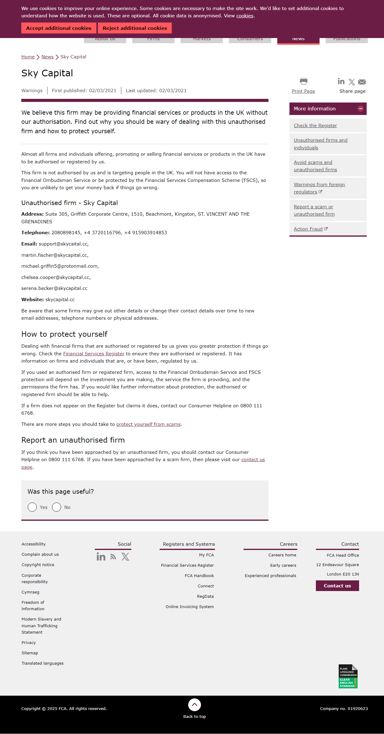 FCA未经授权公司警告名单 天空资本.