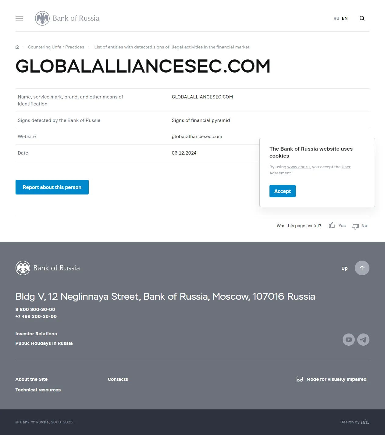 名称、服务标识、品牌及其他识别方式GLOBALALLIANCESEC.COM 俄罗斯银行检测到的迹象 金融金字塔迹象 网站 globalalliancesec.com 日期 2024年12月6日.