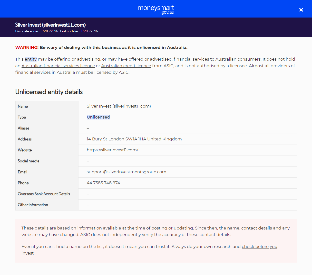 名称Silver Invest (silverinvest11.com) 类型无证经营向澳大利亚民众提供金融服务(包括金融产品),但未持有澳大利亚证券与投资委员会(ASIC)颁发的澳大利亚金融服务(AFS)牌照或澳大利亚信贷执照。 别名– 地址英国伦敦SW1A 1HA伯里街14号 网址https://silverinvest11.com/ 社交媒体– 电子邮箱support@silverinvestmentsgroup.com 电话44 7585 748 974 海外银行账户信息– 其他信息–.