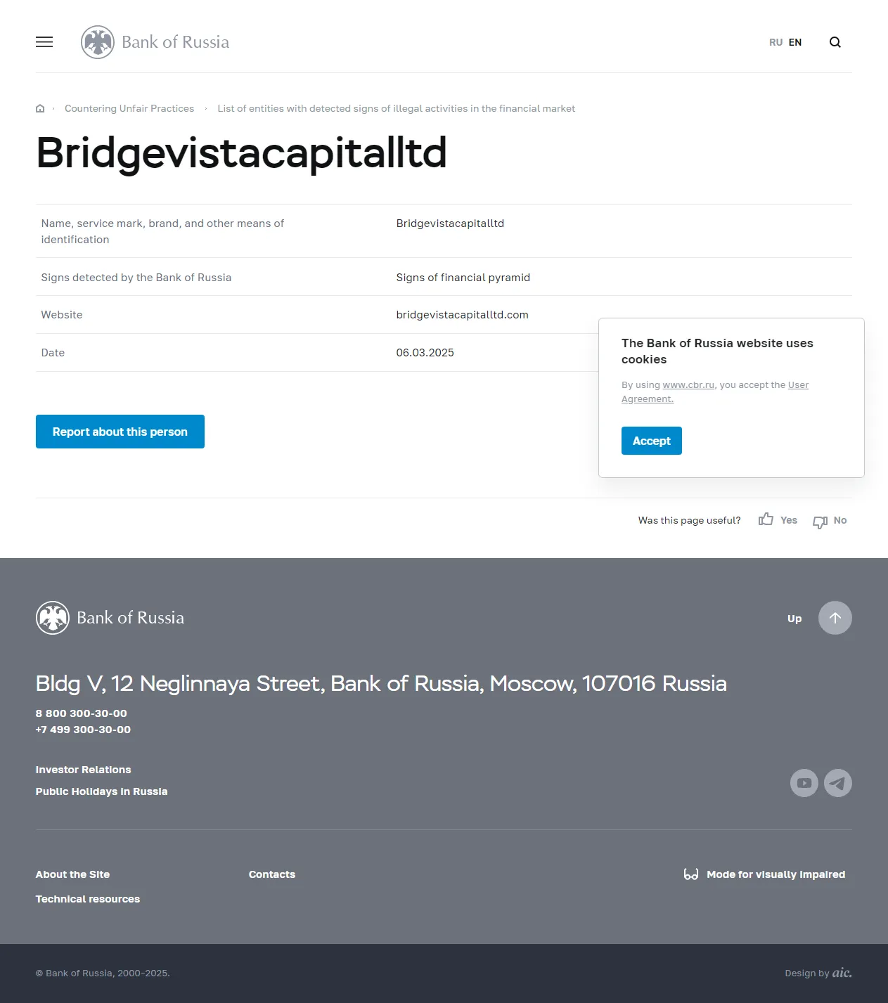 名称、服务标志、品牌及其他识别方式 Bridgevistacapitalltd 俄罗斯银行检测到的迹象 金融金字塔迹象 网站 bridgevistacapitalltd.com 日期 2025年3月6日.