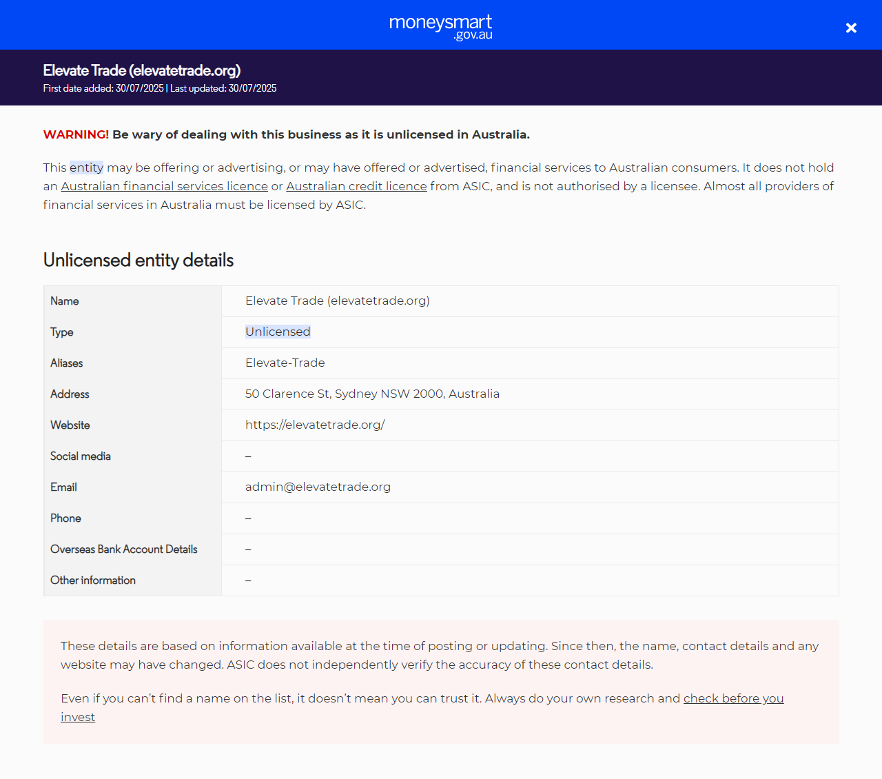 名称Elevate Trade (elevatetrade.org) 类型无牌照向澳大利亚民众提供金融服务(包括金融产品),但未持有澳大利亚证券和投资委员会(ASIC)颁发的澳大利亚金融服务(AFS)牌照或澳大利亚信贷牌照。 别名Elevate-Trade 地址澳大利亚新南威尔士州悉尼克拉伦斯街50号,邮编2000 网址https://elevatetrade.org/ 社交媒体– 电子邮箱admin@elevatetrade.org 电话– 海外银行账户信息– 其他信息–.