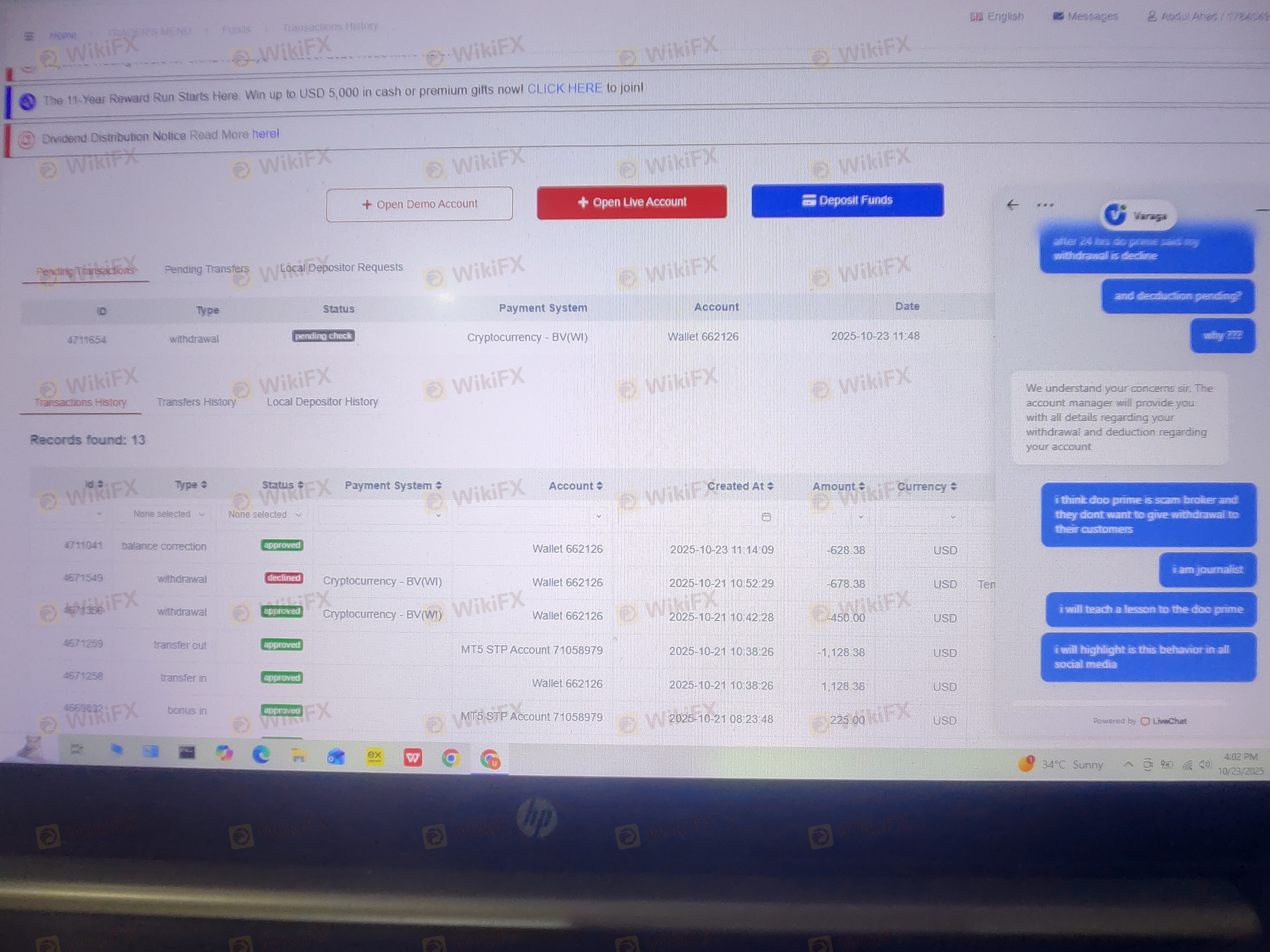 你好,我是Abdul Ahad。我是一名經驗豐富的外匯交易員。我的提款ID 4671549,金額678.38$在等待24小時後被拒絕。doo prime的客服說我的提款會在待扣款後可用。但過了一段時間,我的全部金額628.38在沒有任何通知的情況下從我的帳戶中扣除,只剩下50美元。我多次聯繫他們的線上客服,甚至發送了許多郵件到en.support和dooprime.com,但Dooprime沒有任何回應。Dooprime完全是一個詐騙經紀商。請大家小心這個詐騙經紀商。他們永遠不會給你提款。他們只想要我們的存款。我真的很擔心我的提款。所以請有人幫我處理這件事,我需要從dooprime拿回我的金額628.38$。doo prime關於我的提款金額628.38$從我的錢包中扣除 沒有任何 Abdul Ahad 執行主要客戶 ID 1784049