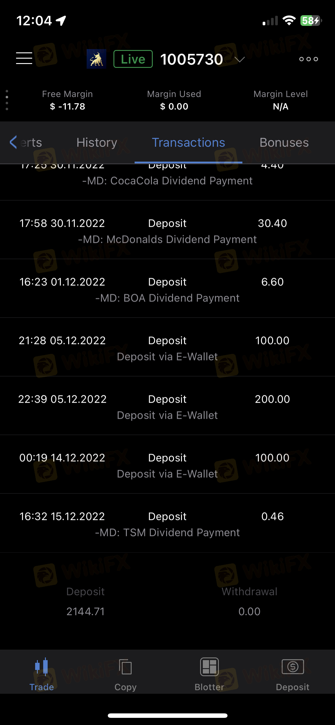 这个平台的中介人不靠谱,如果要投资千万不要投太多钱,一开始我投了100usd,然后爆仓了,过后他叫我加1000usd保证盈利,可是我告诉他我没有这样多,他叫我进500usd(用bonus来诱导),过后快爆仓了他叫我再入金100,结果没有用、又爆仓了,过后他叫我入1000usd(用bonus诱导我入金),100%可以赚回700usd,结果撑了1-2个月,爆仓了,过后他叫我加钱来保住(也是用bonus来诱导),我相信不是我的问题,我自己投资没有亏损,后两张图是我自己投资的