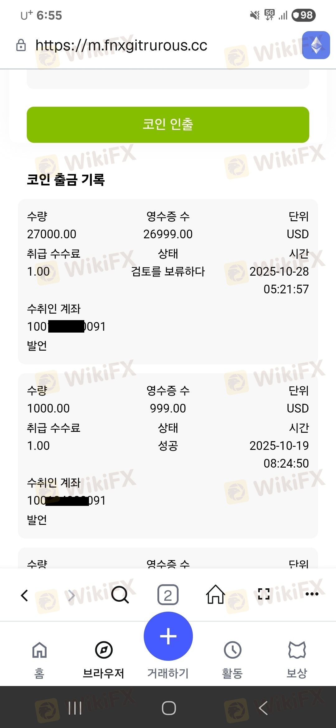 돈 입금하는순간 출금 불가함 끊임없이 이런저런 이유로 입금 유도 출금은 할 수 없음 현재 57000달러 묶여 있습니다 그리고 27000달러 출금을 10월 28에 신청했는데 아직 검토 보류 중