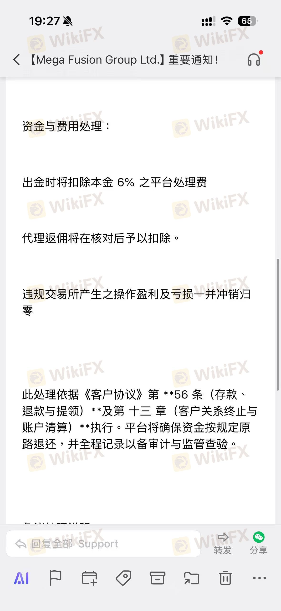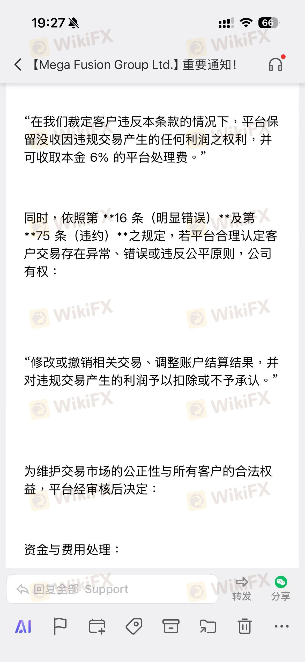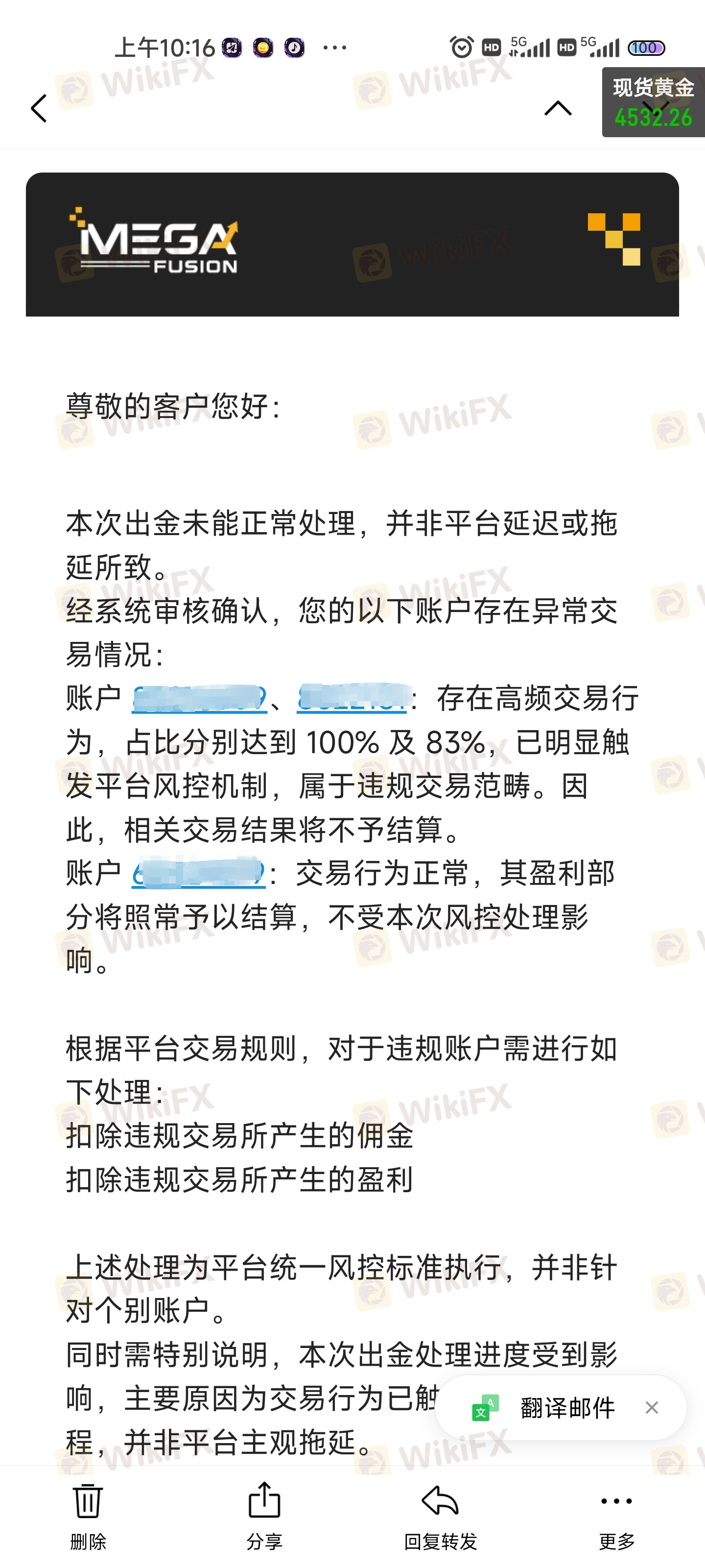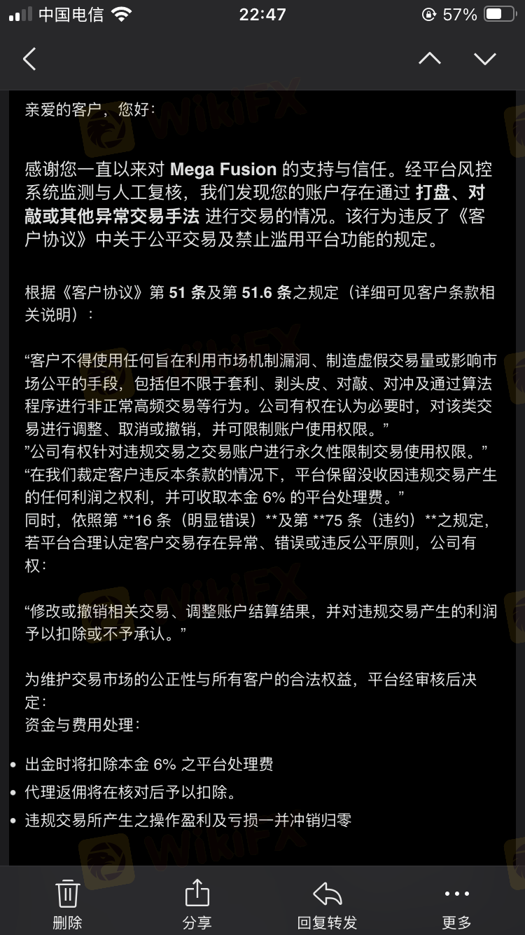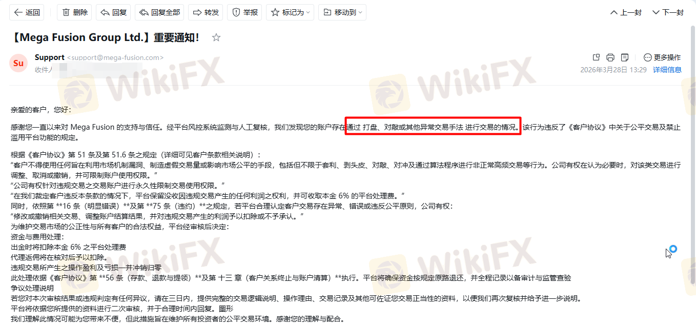 MEGA FUSION 安汇 发邮件说我违规交易准则扣留我($1,119.71/USD),我盈利不给出金,我需要出金。