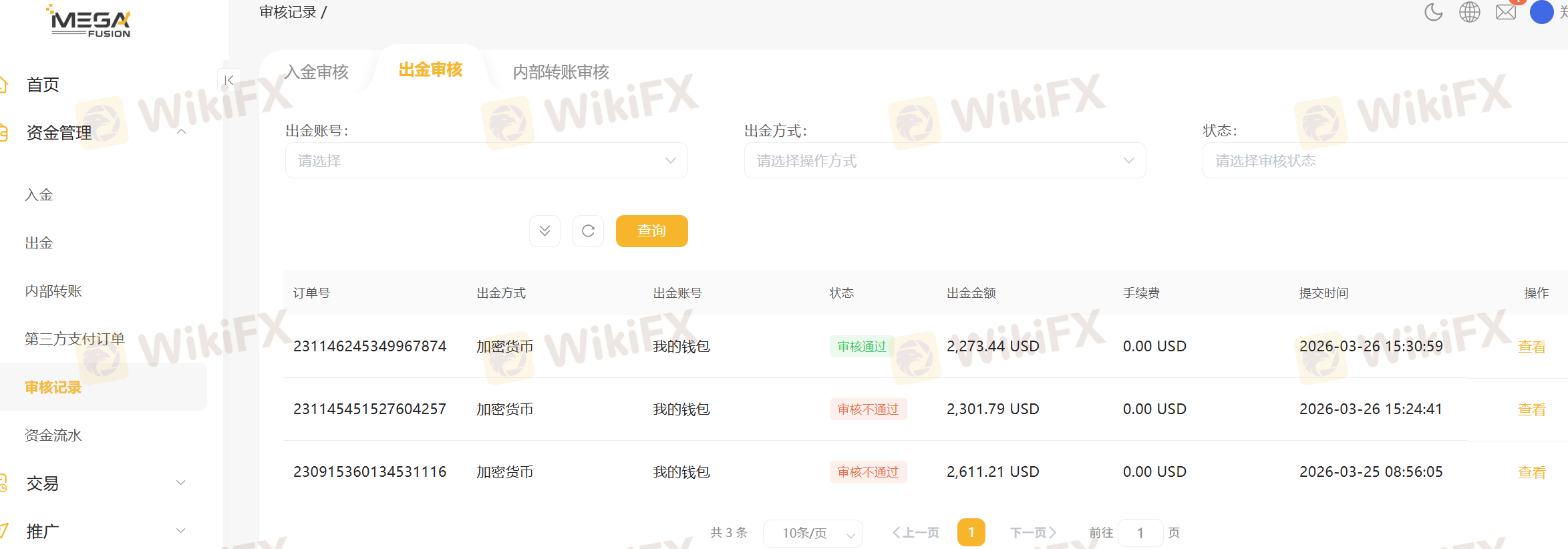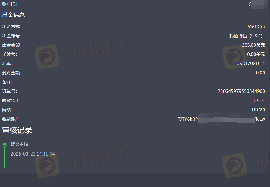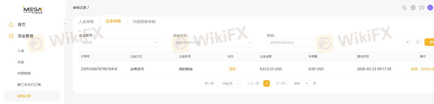 出金申请:9,612.33 USD(未审批)