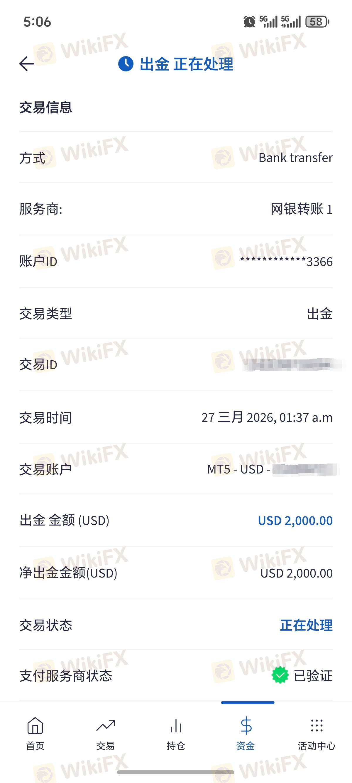 從12月出金一直至今無法出金,出金時扣的手續費也不返回,分別用過的理由有資料不全,銀行信息錯誤,手續費沒算清,總之各種理由就是不出金,說白了就是想一直拖著等閑置費和出金手續費扣光!是一個騙子平臺!大家不要上當受騙!