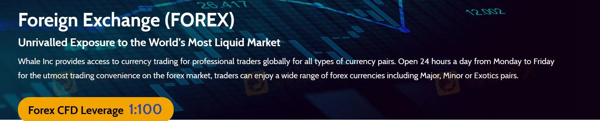 匯鯨 Inc. 提供全面的市場工具陣列,以滿足全球交易者的多樣化需求。通過進入外匯 (FOREX) 市場,專業交易者可以在包括主要、次要和異國貨幣對的廣泛貨幣對中進行貨幣交易,為世界上最具流動性的市場提供無與倫比的曝光。外匯市場每天24小時、每週五天運作,確保不同時區的交易者交易便利。