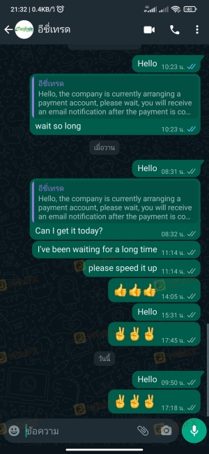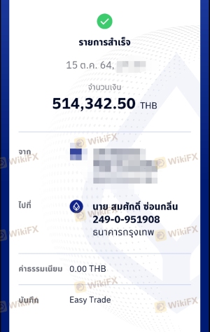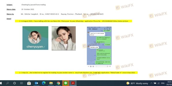 我的名字是 Sittichai Sangdech,在 Meta trade 4 的外匯交易中被騙。交易商是EasyTradeMarket Co,Ltd 在香港使用手機號碼 +852 6425 8165。 1)8月份,我通過Whatapp和Line應用程序與陳玉燕女士討論,她使用+85246486660 與我聯系。 2)2021年9月3日,我注冊交易賬號EasyTradeMeta,在Trader 4 應用程序的市場上交易。 3)2021 年 9 月 6 日,在交易之前,我們已經將錢從 Kasikorn 銀行賬戶 1782601071 轉移到泰國的 4 個賬戶以轉移。 4)但是在2021年10月13日,我想出金 18,400 美元。但在超過 5 個工作日的截止日期后失敗。 5)2021年10月21日,我向 Pluakdang 警察局舉報。