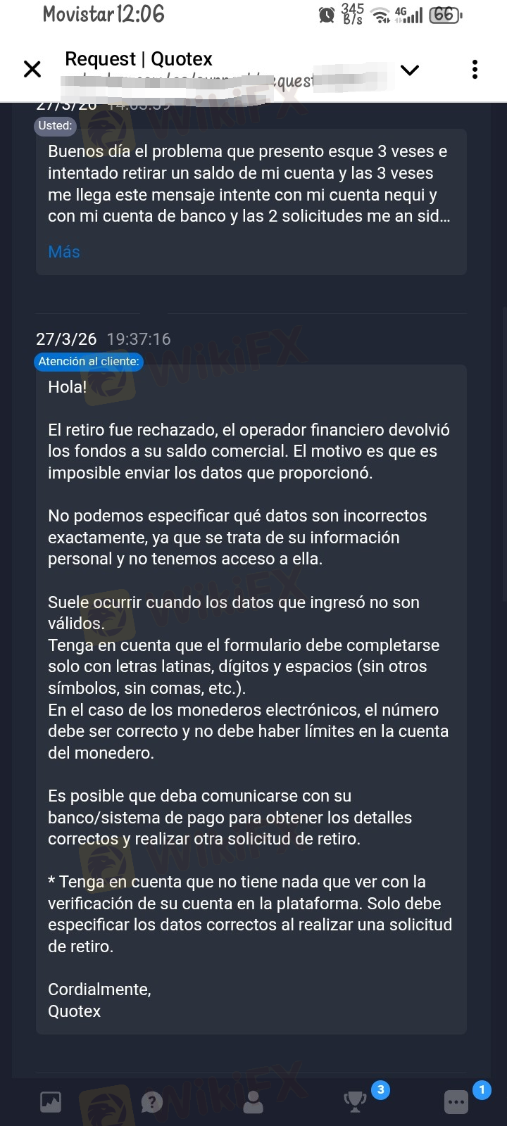 下午好,我的問題是我已經嘗試從平台提取我的餘額6次,而提款被退回,說某些資料不符,但我已確保輸入正確,而他們沒有提供更多解決方案,只說要我檢查我的資料,因為他們不知道我的哪個資料是錯誤的,所以他們沒有給我任何解決方案。