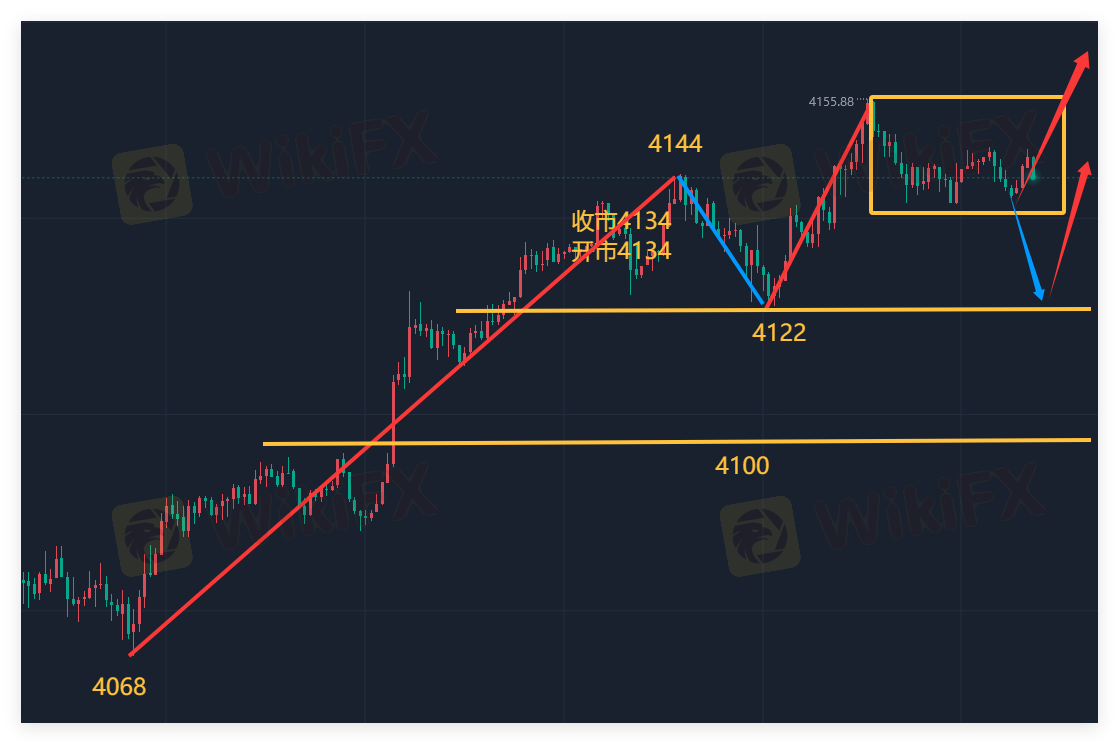【行情回顾】黄鱼晚间十点半继续开始爬升,最终收在4134,早间亚早盘继续小幅拉升,到4144后小幅回落,回落至最低4122后再次拉涨,最高到4155,目前在40-50窄幅震荡