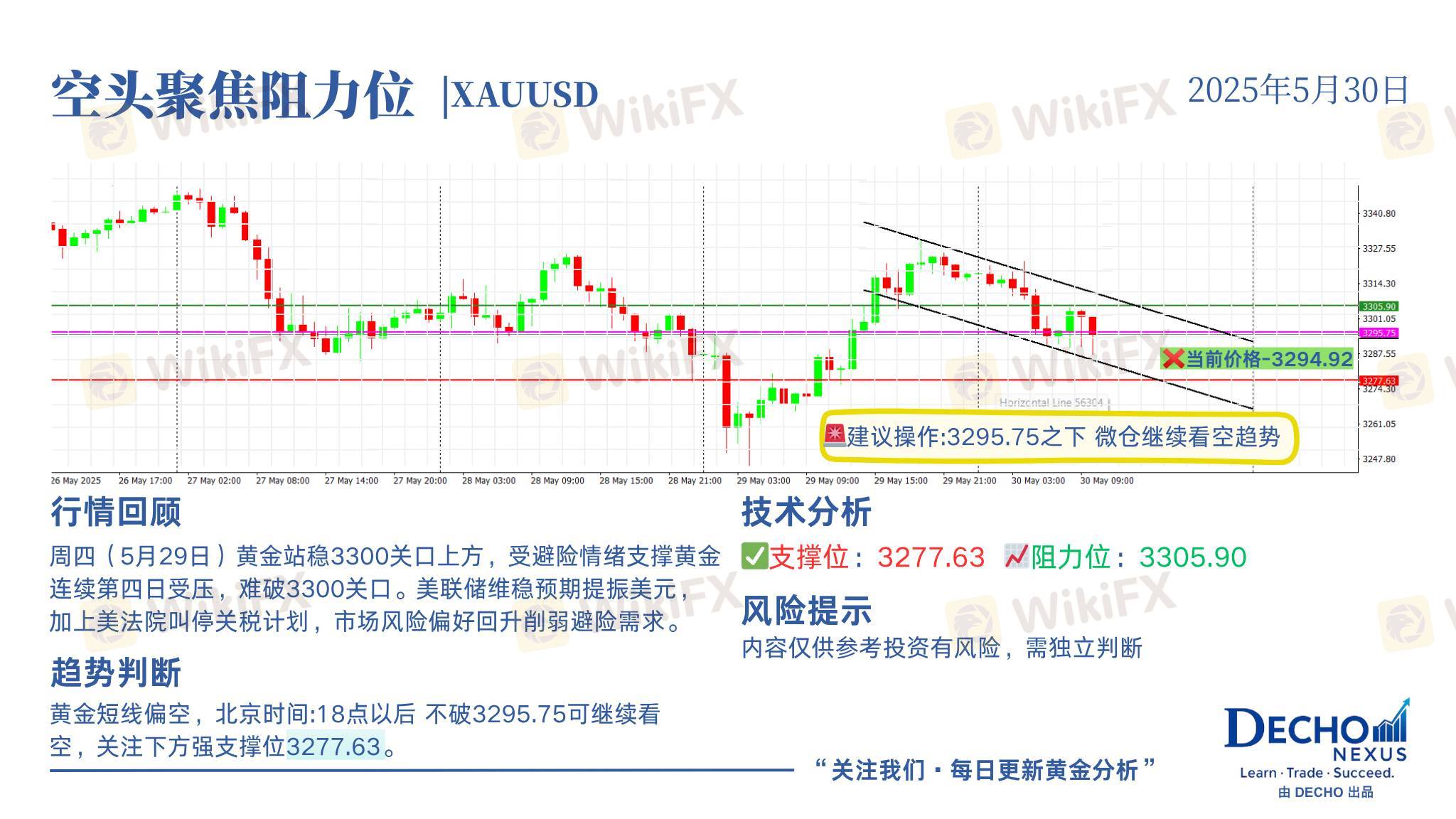 周四(5月29日)黄金站稳3300关口上方,受避险情绪支撑黄金连续第四日受压,难破3300关口。美联储维稳预期提振美元,加上美法院叫停关税计划,市场风险偏好回升削弱避险需求。