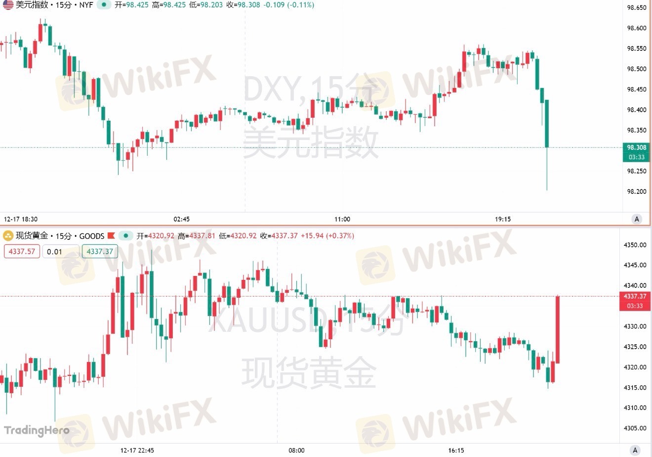 数据公布后,金融市场瞬时掀起波动:美元指数短线下挫22点,最低触及98.20;现货黄金则应声上扬16美元,最高冲至4336美元/盎司;非美货币集体走强,欧元兑美元走高近30点,美元兑日元短线下挫近40点至155.34。利率市场对宽松的预期同步升温,美国联邦基金利率期货显示,美联储1月降息概率从26.6%升至28.8%,市场预计2026年底政策将再放松3个基点,全年宽松幅度有望达62个基点。