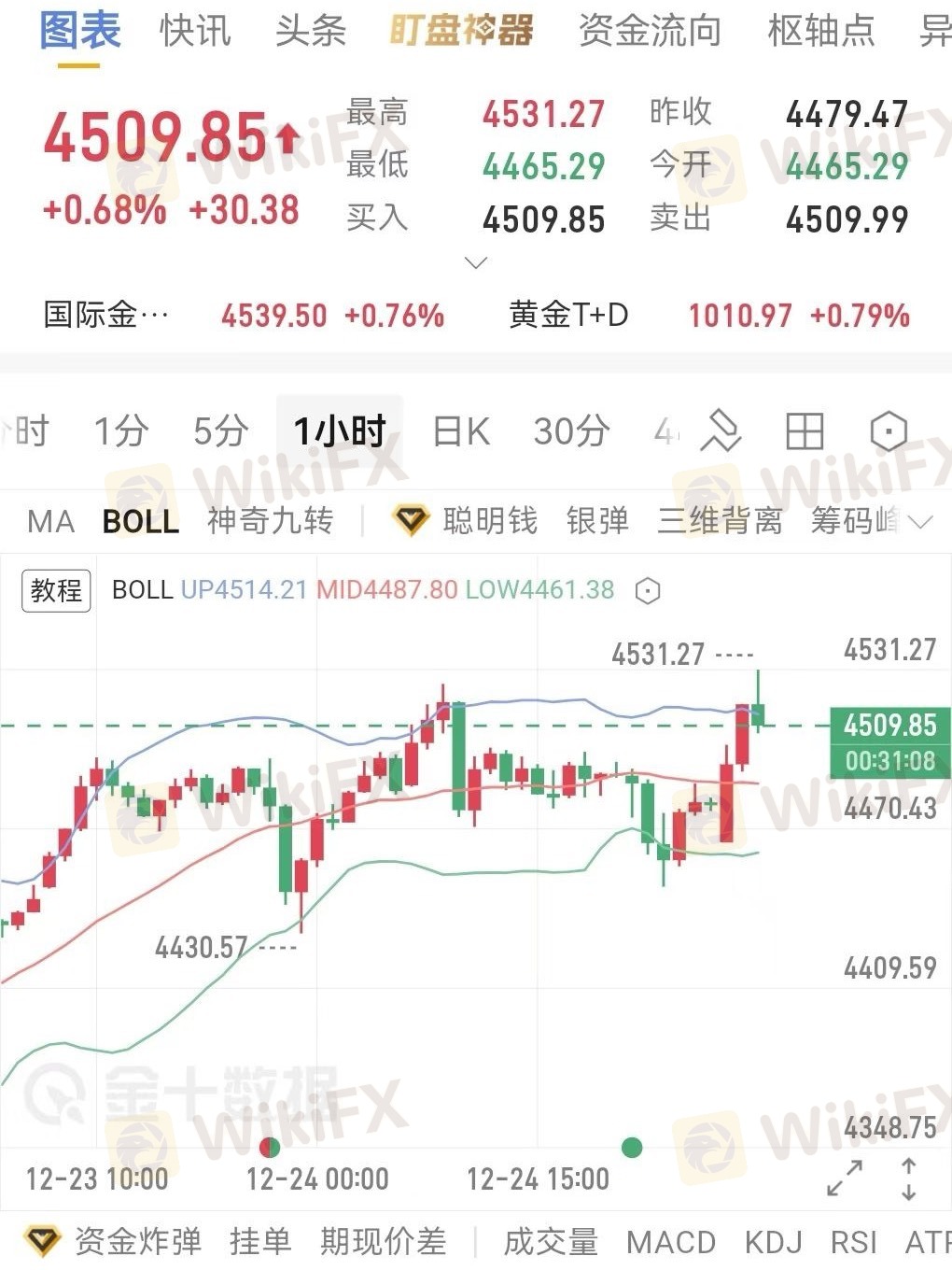 阻力就看4530-4535这一带,再加上之前4525的历史高点压着,这里买盘力气快耗光了,大概率是短期顶部。支撑分好几层:先看4500这个心理关口,再看4480,接着是4450-4430,最关键的防守位是4400,要是跌破4400,就往下看4370-4350。趋势上,日线还是涨势,但小时线已经冲不动了,最近“冲高就跌”的循环很明显,多头力气在慢慢变少,短期震荡回调的概率更大