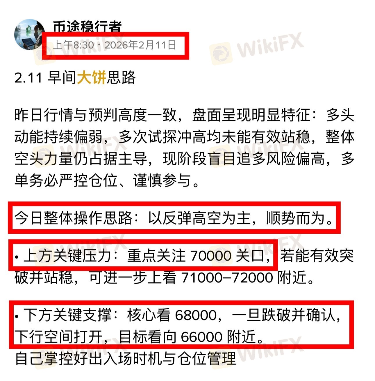 思路从一开始就非常明确:上方重点关注七万整数关口,盘面承压信号极强,明确给出下方目标——跌破68000看至66000。
