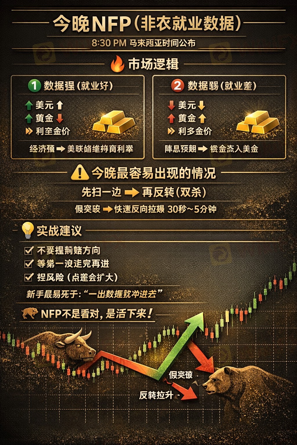今晚是 Non-Farm Payrolls(非农就业数据),这是市场最容易“爆波动”的时间点之一 📊给你一个交易角度的简单重点版👇⸻📅 今晚重点(马来西亚时间)通常在 晚上 8:30 PM(MYT)公布⸻🔥 市场逻辑(重点记住这个)1️⃣ 数据强(就业好)👉 美元 ↑👉 黄金 ↓👉 利空金价原因:就业强 → 经济强 → Federal Reserve 更可能维持高利率⸻2️⃣ 数据弱(就业差)👉 美元 ↓👉 黄金 ↑👉 利多金价原因:经济放缓 → 降息预期 ↑ → 资金流入黄金⸻⚠️ 今晚最容易出现的情况(重点)👉 先扫一边 → 再反转(双杀)常见剧本: • 数据一出 → 瞬间暴涨/暴跌(假方向) • 30秒~5分钟 → 反方向拉爆⸻💡 实战建议(重点给你)✔ 不要提前赌方向✔ 等第一波走完再进✔ 控风险(点差会扩大)👉 新手最容易死在:“一出数据就冲进去”🧠 给你一句今晚核心:👉 NFP不是看对,是活下来