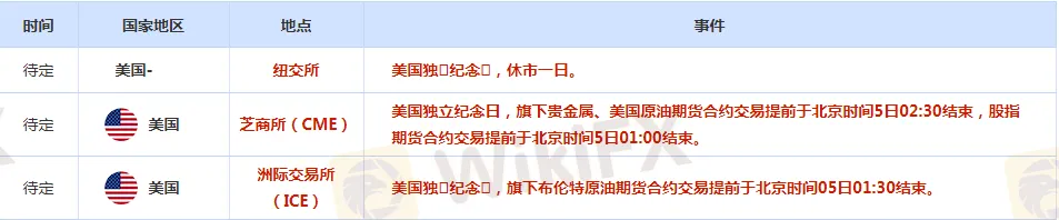 本交易日是美國獨立日假期,美國市場休市,CME旗下貴金屬期貨合約交易提前於北京時間7月5日02:30結束,美國經濟數據已提前至週三公布,市場交投可能受到限制。