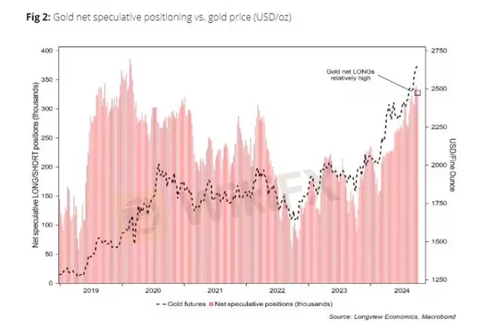 Watling則指出,「除了不斷變化的利率(和美元)前景外,從部位、情緒和技術模型的角度來看,黃金也容易面臨下行風險。」他指出,投機性頭寸很擁擠,衡量市場情緒的指標是看漲的,技術指標處於或接近賣出閾值。